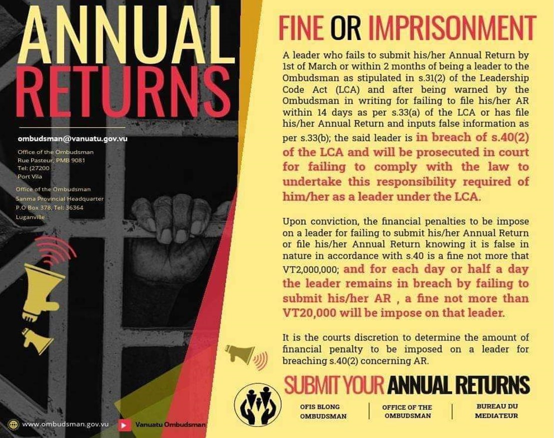 The Ombudsman of Vanuatu reminds every person defined as a Leader under the Constitution of the Republic of Vanuatu and the Leadership Code Act [Cap.240] to file their Annual Returns for 2025 with the Office of the Ombudsman no later than 1st March 2026.